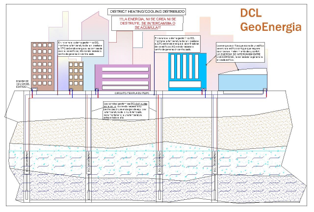 La sencillez de este tipo de instalaciones radica en la comunicación mediante tuberías por la que circula un fluido que entrega energía calorífica en unos edificios y frigorífica en otros edificios, mediante el uso de las sondas geotérmicas DCL, por lo tanto, la energía se intercambia los edificios sin necesidad de tener que generarla de forma independiente para cada uno de ellos.